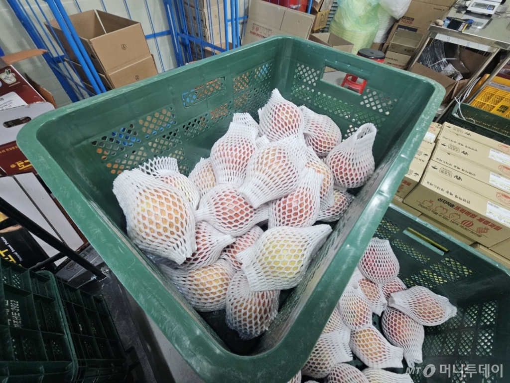 한씨는 화성 유통센터에서 지난해 이맘때쯤 1주일에 5t(톤)가량의 사과를 소비자에게 판매했다. 요즘은 2~3t으로 줄었다. 그는 일반 소비자를 상대로 쿠팡과 네이버스토어를 통해 2·3·5㎏ 단위로 사과를 포장해 판매한다. 요즘 판매량은 하루 평균 100~200박스 수준. 지난해 이맘땐 200~300박스를 팔았다.