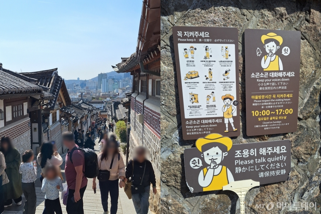 1일 오전 11시 서울 종로구 북촌로 11길. 한옥과 남산 전경을 볼 수 있어 포토 스팟으로 꼽히는 이곳에 표지판 하나가 붙어있었다. "소곤소곤 대화해달라" "금연 해달라" "전화기는 진동으로 해달라" "불법주차는 하지 말아달라"는 안내가 적힌 표지다.