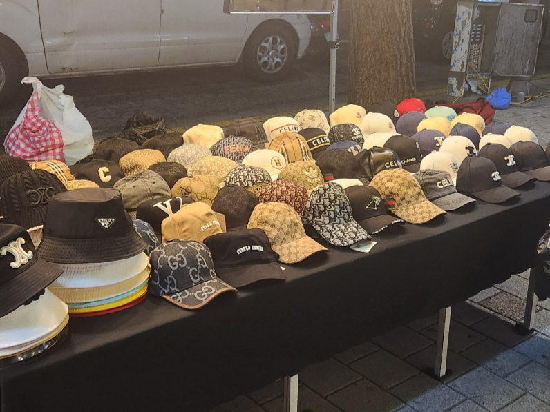 모자 전문 점포는 매대 위 야구 모자 50여종과 챙이 넓은 모자 20여종을 차곡차곡 늘어놨다. 아이브 멤버 장원영이 착용해 인기를 끈 명품 브랜드 미우미우, 블랙핑크 리사가 썼던 셀린느와 디자인이 같았다. 명품 브랜드 로고가 수놓아진 이 모자들은 1개에 3만원에 팔렸다. 매대에 있던 야구 모자와 디자인과 색깔마저 같은 셀린느 '이니셜 베이스볼 캡' 공식 판매가는 79만원이다.