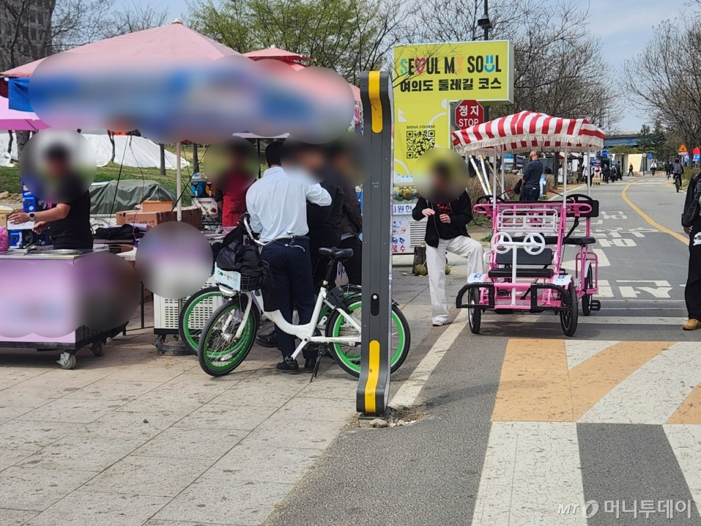 이날 여의도 한강공원에 자전거를 타러 온 40대 김모씨는 "평일은 덜한데 주말이 되면 노점상 앞에 대기 줄이 길게 늘어져 자전거 전용 도로까지 사람들이 서 있는 경우가 많다"며 "자전거 속도를 내지 않아도 통행에 불편함이 있고 위험하다는 생각도 든다. 웬만하면 도로 안쪽으로 줄을 서면 좋을 것 같다"고 말했다.
