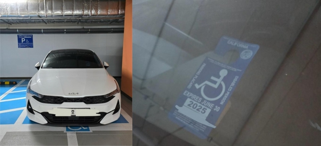 해당 차량 앞 유리엔 장애인 주차증이 있었는데, 자세히 보면 한국 정부에서 발행된 것이 아닌 미국 캘리포니아주에서 발급된 것이었다.