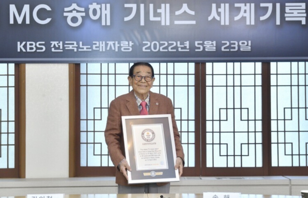 그는 2년 전인 2022년 4월 12일 '최고령 TV 음악 프로그램 진행자'로 기네스 세계기록에 등재됐다. 당시 95세였던 송해는 이미 대한민국 최고령 방송인이었다.