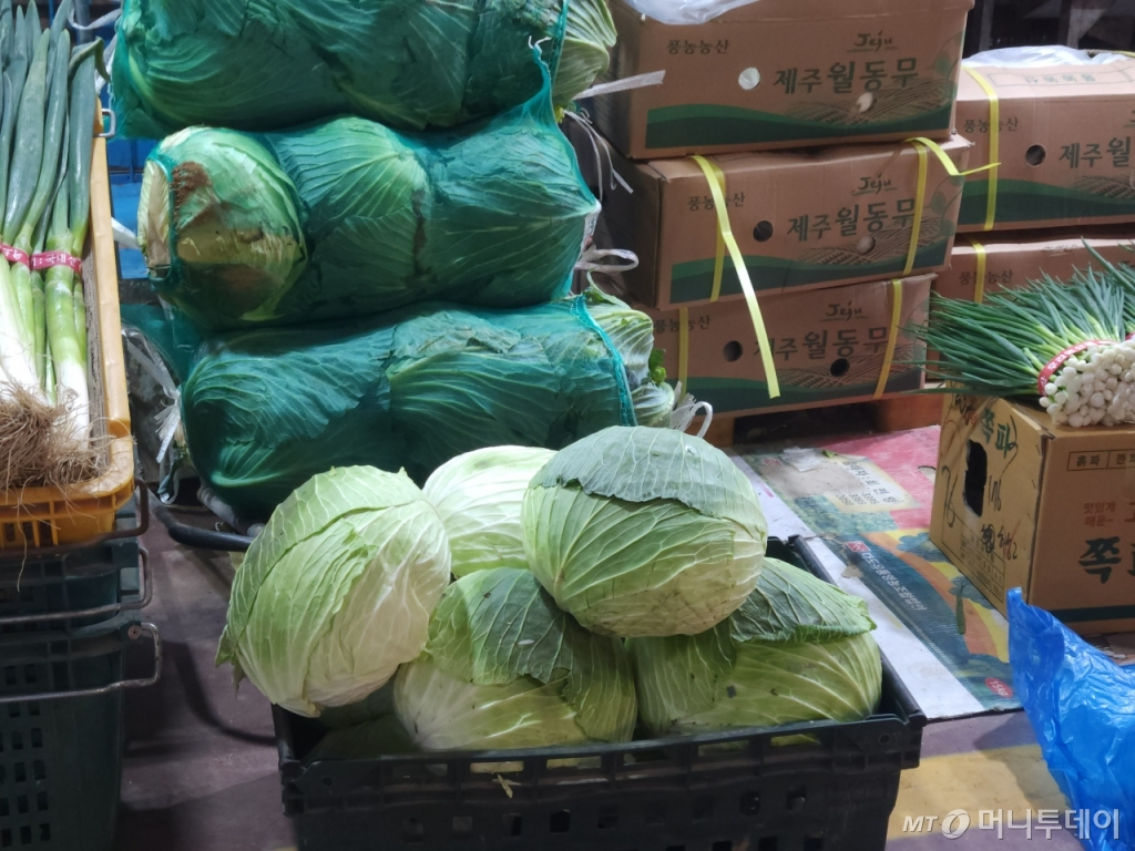 17일 서울 마포구 마포농수산물시장에서 채소류를 판매하는 김모씨(64)는 손사래 치며 이렇게 말했다. '국내산 무 2000원' '미나리 2000원' '깐 쪽파 3000원' 등이 쓰인 다른 채소와 달리 양배추에는 가격이 쓰여있지 않았다. 김씨는 "가격이 너무 비싸니 가격을 적어두면 사람들이 다 떠나 일부러 안 적어놨다"며 "3통이 든 한 망에 2만5000원인데 얼마 전에는 3만원까지 받았다"고 밝혔다.