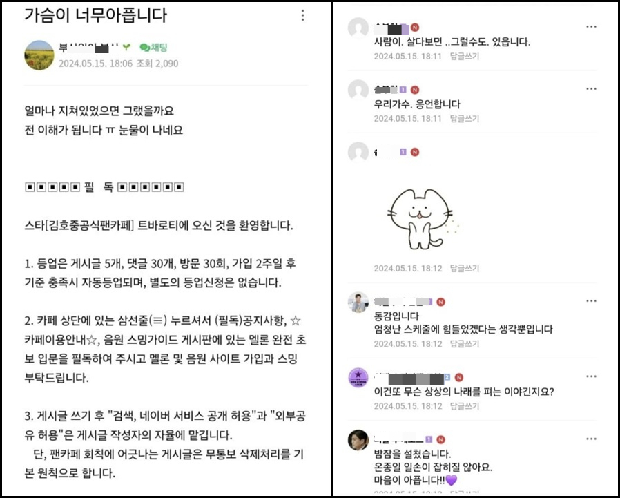 16일 온라인 커뮤니티 등에서는 김호중 공식 팬카페인 '트바로티'에 팬들이 가수를 응원하면서 올린 글이 화제가 되고 있다. 대부분이 응원한다는 댓글들이다.