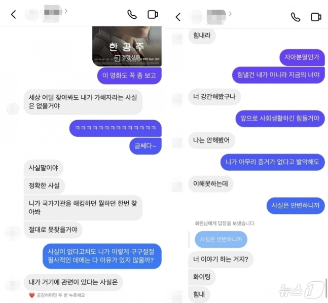 A씨가 "사실이 없다고 해도 네가 이렇게 구구절절 필사적인 데에는 다 이유가 있지 않을까?"라고 하자, 남성은 "네가 국가기관을 해킹하든 뭘 하든 한 번 찾아봐. 내가 거기에 관련 있다는 사실은 절대로 못 찾을 거다. 힘내라"라고 당당하게 대응했다.