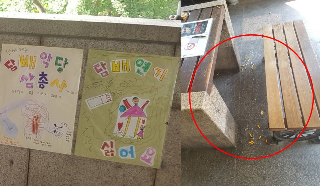 사진을 보면 문제의 장소에는 '담배에는 담배 악당 삼총사가 있어서 우리들의 몸을 아프게 해요', '담배 연기 싫어요' 등 유치원생이 그린 것으로 보이는 포스터가 붙어 있다.