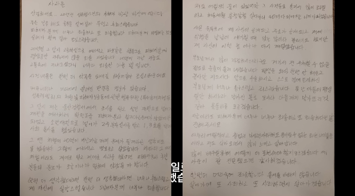 20일 한 유튜브 채널은 밀양 집단 성폭행 가해자 박모씨에게 전달받은 사과문을 공개했다.