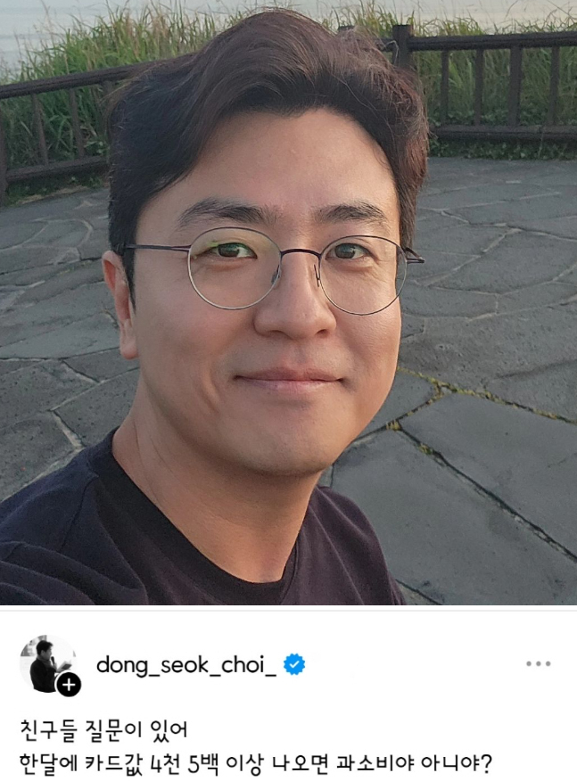25일 최동석은 자신의 스레드에 "친구들 질문이 있어"라며 "한 달에 카드값 4500 이상 나오면 과소비야 아니야?"라는 질문을 던졌다.