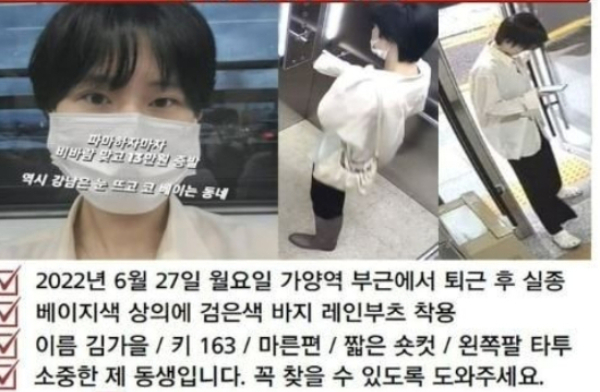 가족이 만든 전단지에 따르면 김씨는 키 163㎝에 마른 편으로, 당시 짧은 숏컷 머리에 베이지색 상의, 검은색 바지 그리고 레인부츠를 착용한 상태였다. 왼쪽 팔엔 타투가 있다고 한다.
