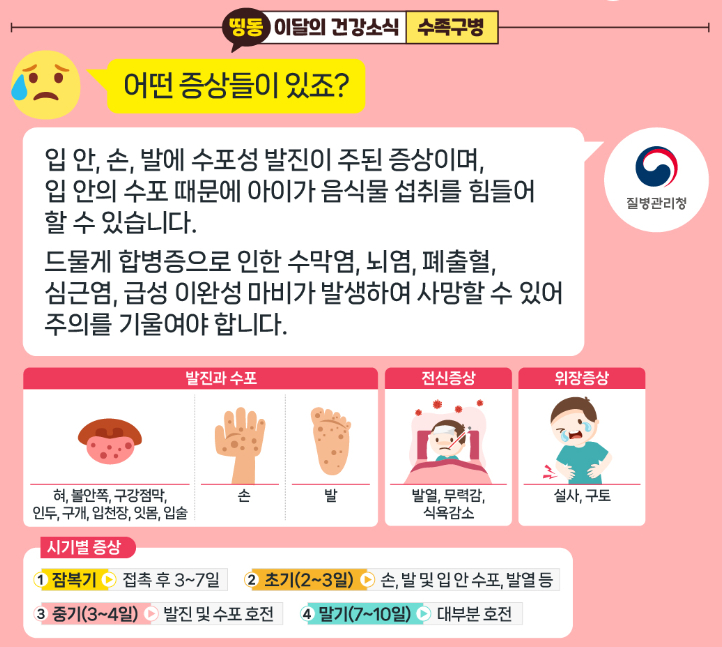 수족구병은 더운 날씨에 많이 발병하는데 엔테로바이러스 일종인 콕사키바이러스가 주요 원인이다. 비말, 분변, 접촉 등을 통해 감염된다. 입안에 물집이 잡히고 손과 발에 수포성 발진이 나타나는 것이 특징이다.