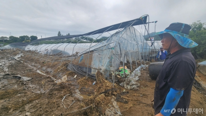 하우스는 철제 파이프가 엿가락처럼 휘어 아래로 무너져 내렸다. 비닐이 대부분 뜯겨져 나가 처참한 몰골이었다. 떠내려온 질퍽한 흙과 지푸라기 더미가 어지러웠다. 복구 작업을 하던 한 60대 남성은 "밭이 완전히 갯벌이 돼버렸다"고 말했다.