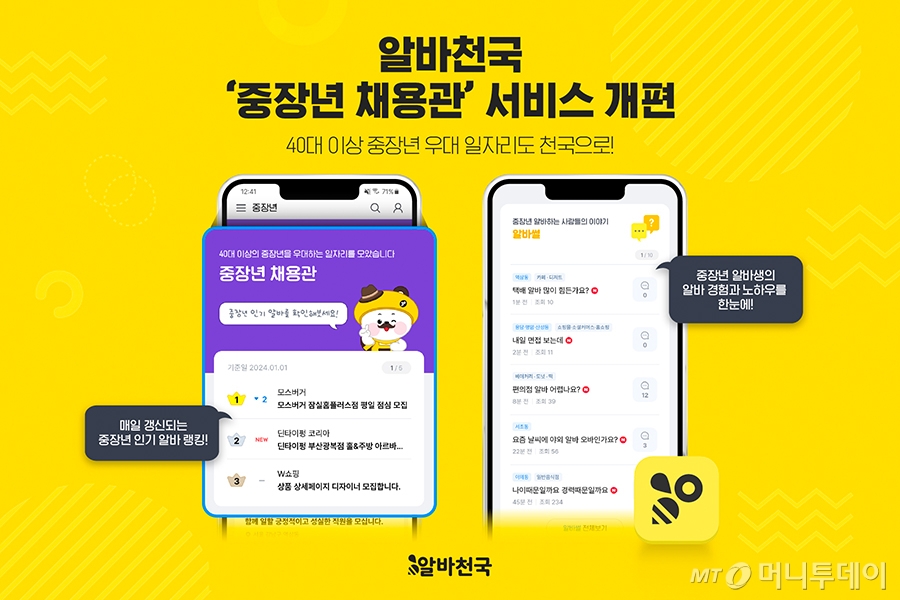 최근 5년새 알바천국으로 40대 이상 중장년의 유입이 많아진 상황이다. 고물가로 생활이 빠듯한데 중장년도 이제 플랫폼 구직이 익숙하고, 자영업자들도 중년 알바를 채용하는 거부감이 전보다 낮아진 영향이다(관련 기사 : 꿀알바 찾아 천국으로…4050 구직자 4년새 222% 뛰었다). 알바천국 관계자는 "중장년 채용정보는 물론이고 구직 팁과 노하우까지 당사 플랫폼에서 얻으시기 바란다"고 말했다.