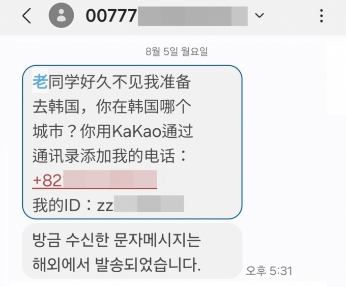 서울 광진구에 사는 직장인 박모씨(28)는 지난달 5일 '00777'로 시작되는 국제발신번호로 중국어 문자를 받았다. 메시지에는 카카오톡 아이디와 연락처가 모두 적혀 있었다. '방금 수신한 문자메시지는 해외에서 발송됐다'는 안내 문자도 있었다.