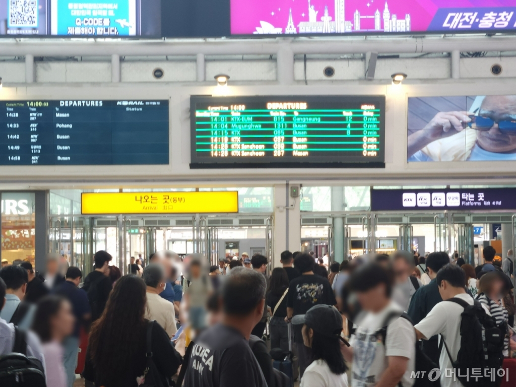 곧 출발을 앞둔 기차 플랫폼으로 내려가는 에스컬레이터 앞에는 코레일 직원이 "두 줄로 서세요"라고 외치며 질서 유지에 한창이었다. 어린 두 자녀를 둔 한 아버지는 탑승 시간이 임박한 지 급하게 둘째 딸을 안아 들더니 아들 손을 잡고 계단을 뛰어 내려갔다.