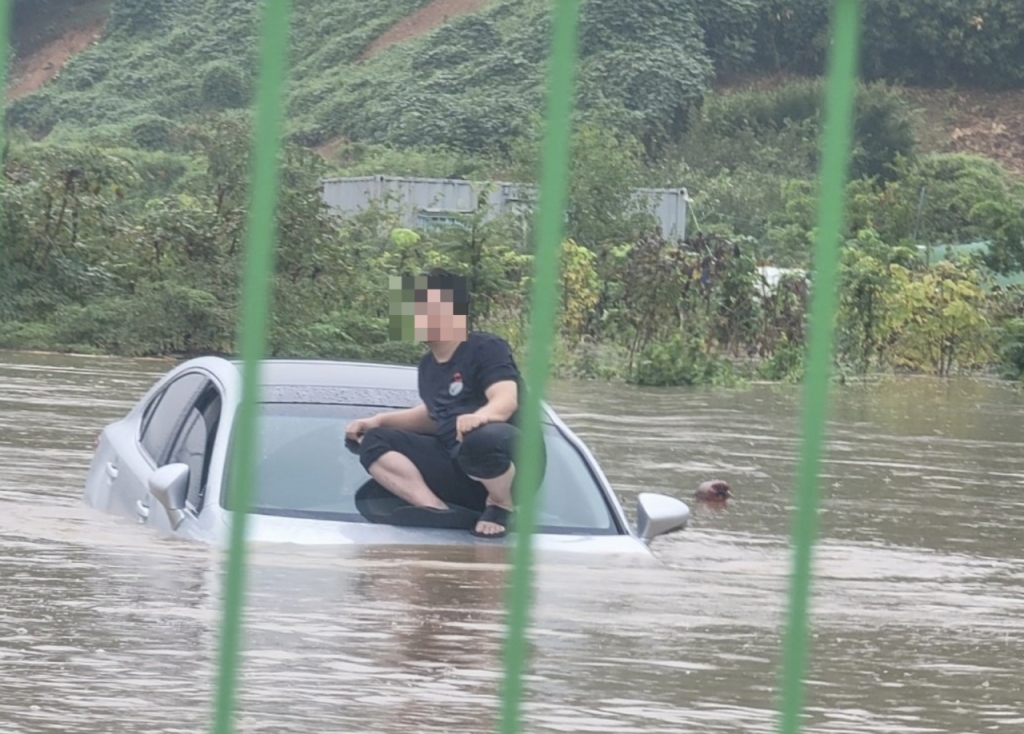 김해시에 지난 20일부터 쏟아진 폭우로 지역 곳곳에서 피해가 발생한 가운데, 한 검은색 티셔츠를 입은 남성이 불어난 물을 피해 차량 보닛 위로 올라가 대피한 모습이 찍힌 사진이다.