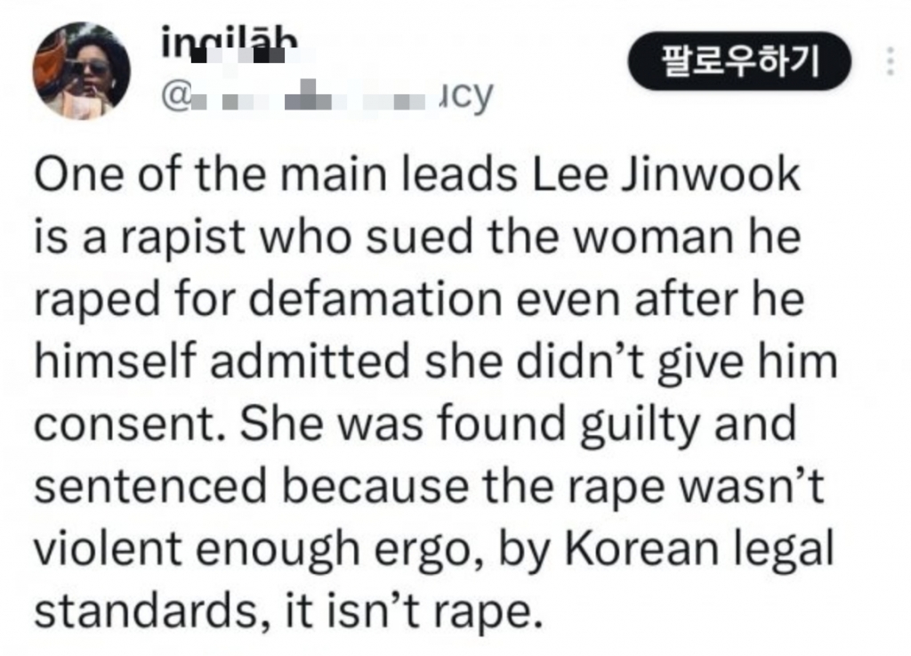해외 사용자 A는 배우 이진욱에 대해 "자신이 강간한 여성을 명예훼손으로 고소한 강간범으로, 여성이 성행위에 동의하지 않았다는 것을 인정하면서도 그녀를 고소했다"고 적었다. 그러면서 "피해 여성은 강간이 충분히 폭력적이지 않았다는 점에서 무고죄로 처벌받았고, 한국 법상으로는 강간이 아니다"고 강조했다. A는 해당 글과 함께 넷플릭스의 '오겜2' 포스터를 게재했다.