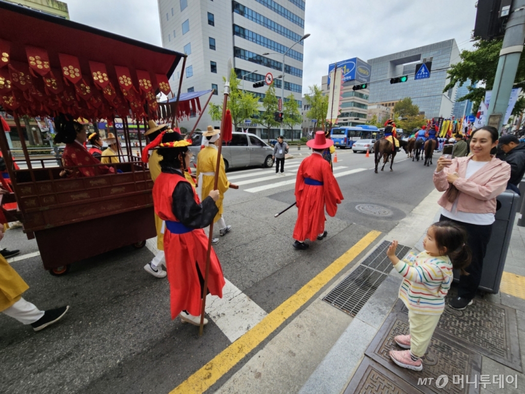 6일 오전 서울 지하철 용산역 앞 한강대로 노들섬 방향 차로. '정조대왕'이라고 적힌 깃발 뒤로 빨간 곤룡포를 입고 백마를 탄 남성이 나타났다. 남성을 중심으로 20명의 말을 탄 무사가 칼을 차고 행렬 선두에 섰다. 깃털과 비단으로 화려하게 장식한 갓을 쓴 무사 뒤로는 가마를 탄 '혜경궁홍씨'가 따랐다. 시민과 외국인 관광객들은 한강대로에 나타난 정조가 신기한 듯 연신 휴대폰을 꺼내 사진을 찍었다.