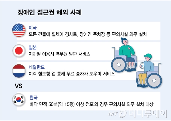 현재 한국에선 '바닥 면적 50㎡(약 15평) 이상 점포'의 경우 장애인 편의시설를 의무적으로 설치해야 한다. 보건복지부의 장애인 편의시설 설치 현황조사 결과 2023년 장애인 편의시설이 의무화 대상인 건물은 19만0991개에 불과했다. 전체건물 수는 739만1084개의 2.6%다.