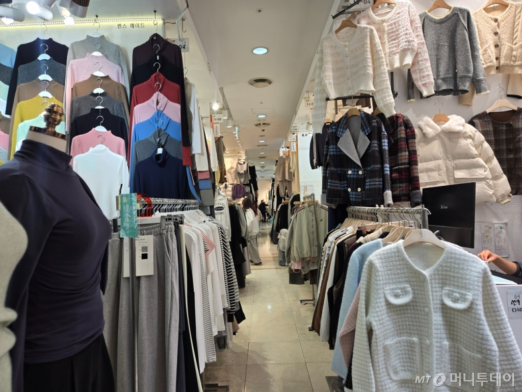 여성 의류 전문도매상가 안은 겨울 준비에 한창이었다. 매장 안에는 갖가지 색의 니트가 진열됐고 겨울 패딩과 무스탕 등 두꺼운 외투도 걸려 있었다. 코트 위에 목도리가 둘려 있는 마네킹도 쉽게 눈에 띄었다.