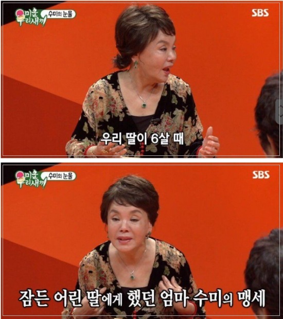 김수미는 과거 SBS 프로그램 '미운우리새끼'에 출연해 잠든 6살 딸에게 새끼손가락을 걸고 맹세한 적이 있다고 밝혔다.