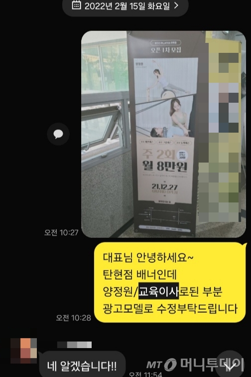 양씨 측이 이날 머니투데이에 공개한 대화 기록에 따르면 양씨는 2022년 2월 C사 대표이사에게 한 홍보물 사진을 보내며 '양정원 교육이사로 된 부분을 광고 모델로 수정 부탁드린다'고 썼다.