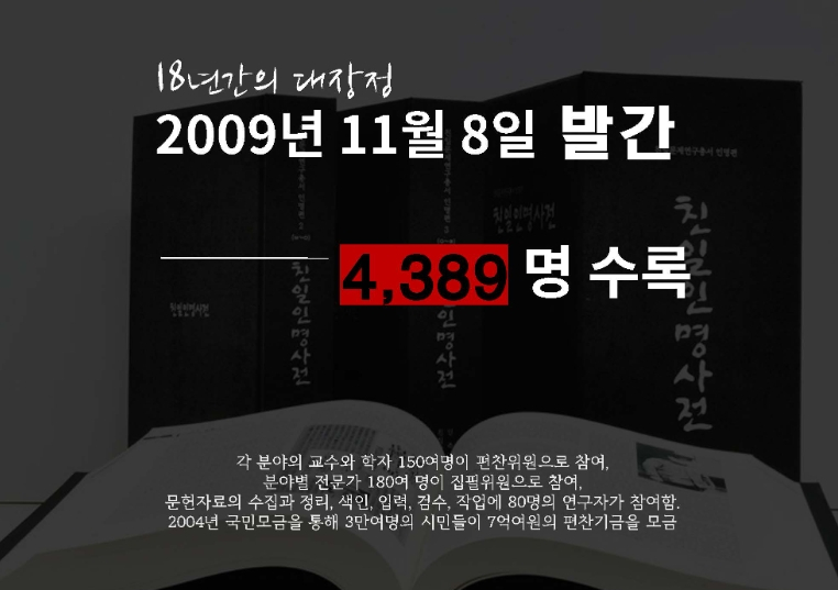 2009년 11월 8일 민족문제연구소가 수년간 준비해온 '친일인명사전'이 마침내 발간했다. 사전은 총 3권에 분량은 3000쪽에 달한다. 여기에는 일제 식민 통치와 전쟁에 협력한 4000여명의 주요 행각과 광복 이후 행적 등이 담겼다. 수록된 인물에는 박정희 전 대통령을 비롯해 장면 전 국무총리, 무용가 최승희, 음악가 안익태, 작곡가 홍난파, 언론인 장지연 등이 포함됐다.