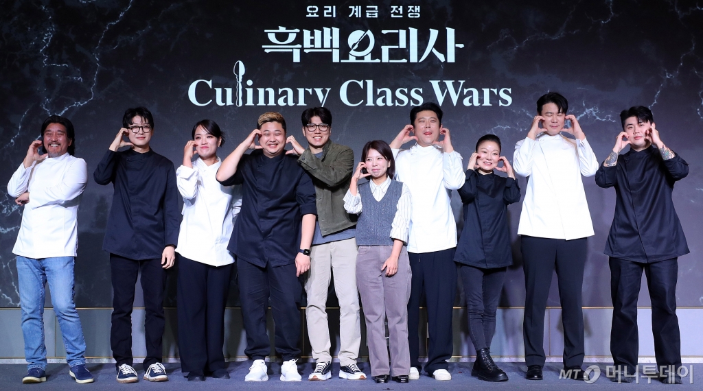 ![[서울=뉴시스] 김혜진 기자 = 흑백요리사에 출연 중인 에드워드 리(왼쪽부터), 트리플 스타, 정지선, 요리하는 돌아이, 김학민 PD, 김은지 PD, 장호준, 이모카세 1호, 최현석, 나폴리 맛피아가 7일 오전 서울 마포구 호텔 나루 서울 엠갤러리에서 열린 넷플릭스 예능 '흑백요리사: 요리 계급 전쟁' 기자간담회에서 포즈를 취하고 있다. 맛 하나는 최고라고 평가받는 재야의 고수 '흑수저' 셰프들이 대한민국 최고의 스타 셰프 '백수저'들에게 도전장을 내밀며 치열하게 맞붙는 100인의 요리 계급 전쟁이다. 2024.10.07. jini@newsis.com /사진=김혜진](https://thumb.mt.co.kr/cdn-cgi/image/f=avif/21/2024/11/2024110908424242706_1.jpg)