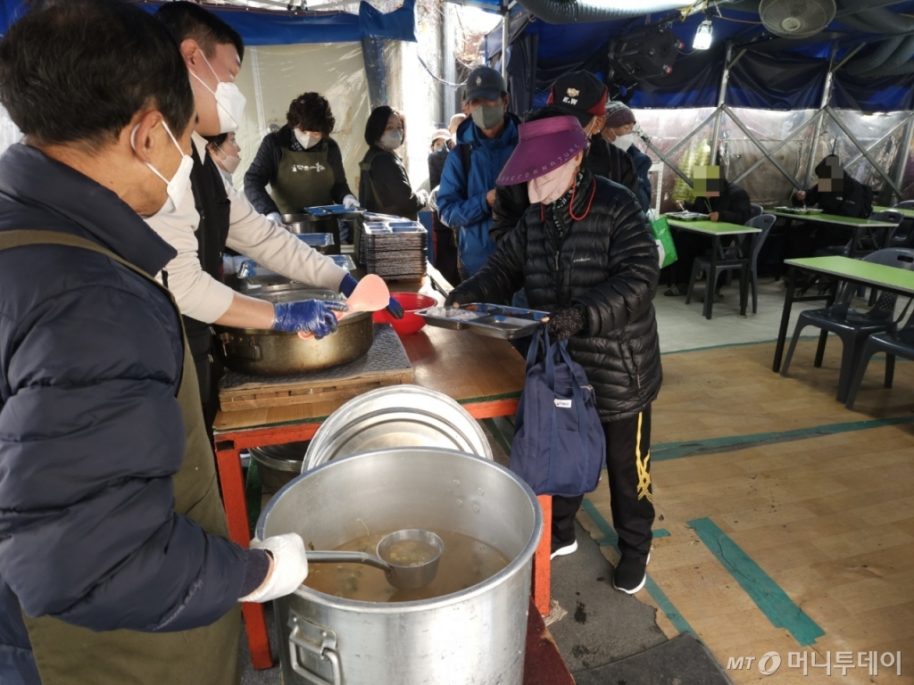 21일 오전 지하철 영등포역 인근 고가다리 밑 천막에 쪽방촌 주민들이 몰렸다. 이곳은 광야교회 산하 사단법인 '사막에 길을 내는 사람들'에서 운영하는 무료급식소다. 최근 날씨가 추워지면서 이곳을 찾는 이들이 부쩍 늘었지만 무료급식소를 운영하는 이들의 표정은 밝지만은 않다. 후원금이 줄었기 때문이다. 최은화 사막에길을내는사람들 사무국장은 "경기 불황 때 가장 먼저 끊는 게 후원금"이라며 "요즘 여기저기서 '형편이 좋아지면 다시 하겠다'며 후원을 중단하고 있다"고 말했다.