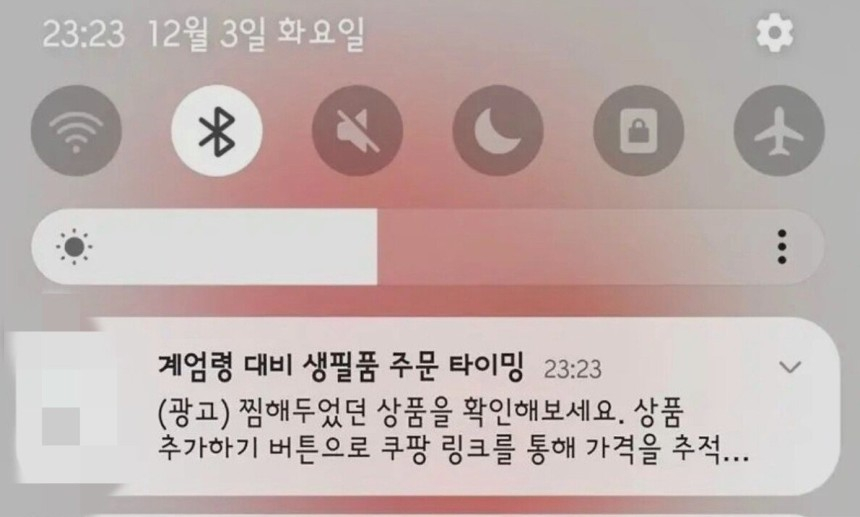 해당 메시지에는 "계엄령 대비 생필품 주문 타이밍. (광고) 찜해두었던 상품을 확인해 보세요. 상품 추가하기 버튼으로 쿠팡 링크를 통해 가격을 추적해 보세요"라고 적혀 있다.