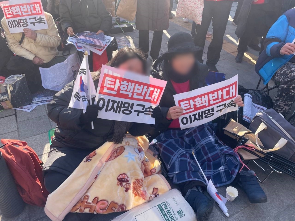 부모님과 함께 현장을 찾은 20~30대들도 눈에 띄었다. 30대 여성 김모씨는 '탄핵반대' '이재명 구속' 팻말을 든 채 돗자리를 깔고 앉았다. 그는 "담화문을 읽고 대통령 마음에 공감해서 응원하고자 나왔다"며 "탄핵 찬성하는 분들의 의견도 중요하지만 미래 세대를 위해서라도 탄핵을 반대하는 게 맞다"고 말했다.