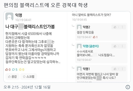 지난 16일 한 온라인 커뮤니티에는 '편의점 블랙리스트에 오른 경북대 학생'이라는 제목의 글이 올라왔다.