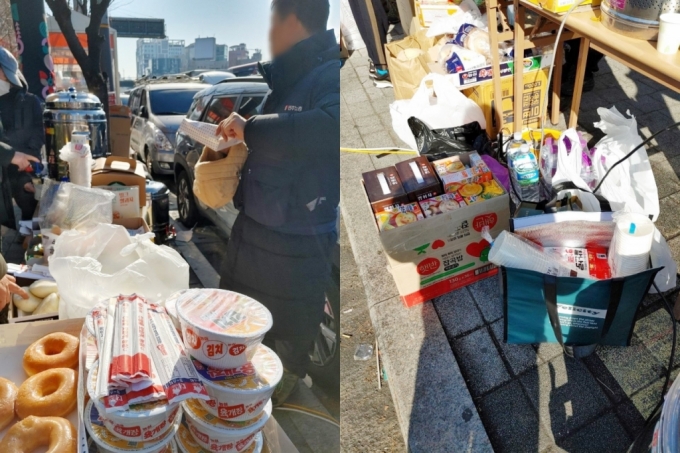 이날 현장에서 따뜻한 커피와 사탕을 나눠주던 최정우 민주노총 미조직전략조직실장(53)은 "어제 밤 8시부터 나눠주기 시작했다"며 "어제는 커피와 라면 중심이었는데 오늘은 시민들 후원 물품이 다양하게 도착했다. 라면과 도넛이 인기가 많아서 가장 먼저 품절됐다"고 말했다.