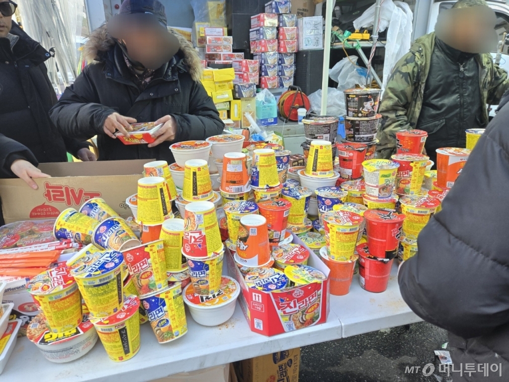 6일 오후 서울 용산구 한남동 대통령 관저 인근 한 천막에 컵라면 수십개가 놓여 있다. 한 50대 남성이 가격을 물으며 주머니를 뒤적였다. 자원봉사자 주모씨(62)는 "돈 안 받는다"며 커피 한 잔을 건넸다. 이곳에선 전날 밤10시부터 시민들에게 컵라면을 제공했다.