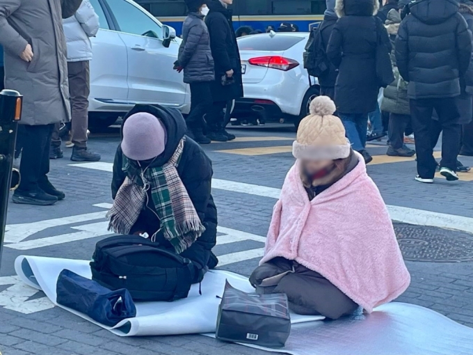 중년 여성 두명은 길에 무릎을 꿇고 약 40분간 두 손 모아 기도를 했다. 체감온도 -3.4도(℃)의 쌀쌀한 날씨 속에서 털모자, 목도리 등을 두르고 오랜 시간 기도를 이어갔다.