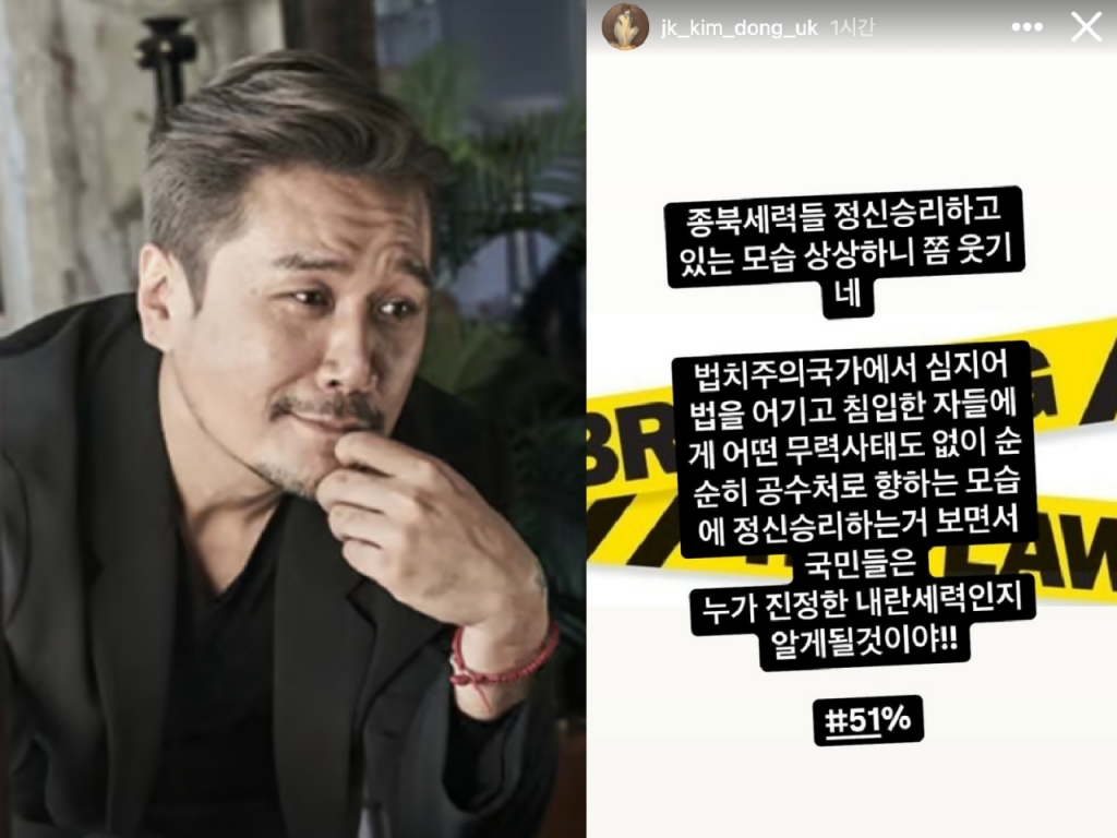 같은 날 인스타그램 스토리에는 "종북세력들 정신 승리하고 있는 모습 상상하니 좀 웃기네"라며 "법치주의 국가에서 심지어 법을 어기고 침입한 자들에게 어떤 무력 사태도 없이 순순히 공수처로 향하는 모습에 정신 승리하는 거 보면서 국민들은 누가 진정한 내란 세력인지 알게 될 것"이라고 강조했다.