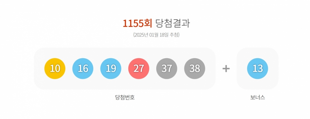 /사진=동행복권 누리집 갈무리. 1155회 로또의 1등 당첨 번호는 10·16·19·27·37·38이다. 2등 보너스 번호는 13이다. 이번 회차의 1등 당첨자는 7명이다. 한명당 40억 6637만여원씩 받는다. 당첨 번호를 5개, 보너스 숫자를 맞힌 2등은 78명이다. 각각 6082여만원씩 받는다. 당첨 번호 5개가 일치한 3등은 3171명으로 약 149만원씩 받는다. 5만원을 받는 4등은 16만366명, 5000원을 받아 로또를 한 번 더 살 수 있는 5등은 265만4046명이다. 독자들의 PICK! 명문대 출신 걸그룹 멤버, 무속인 된 사연…"가족 죽는 꿈 꾸더니" "조갑경, 방송서 '아들 불륜' 나 몰라라…벌 받길" 전 며느리 분노 시부모엔 용돈 30만원, 친정은 불가…"네 월급으로 줘" 남편과 갈등 43세 여가수 임신에 "썩은 양수" 충격 댓글...18년 전 발언 '부메랑'