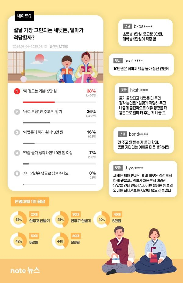 이어 전체 응답자 중 36%(1388명)는 경제적 부담을 들어 '세뱃돈을 안 주고 안 받겠다'고 답변했다. 2023년 설문조사에서 '안 주고 안 받겠다'는 응답이 29%였던 데 반해 크게 증가한 수치다. 특히 이 응답의 41%가 여성으로 남성(29%)에 비해 월등히 높은 비율을 차지했다.