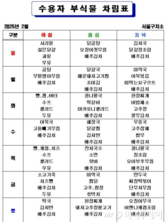 2월 식단표에 적힌 메뉴는 이달 내내 요일별로 반복된다. 내란 우두머리 혐의로 지난 26일 구속 기소된 윤 대통령은 구치소 안에서 형사 재판뿐 아니라 헌법재판소의 탄핵 심판도 준비해야 하는 상황이다.
