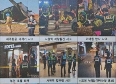 그러면서 실제 지역 경찰들이 근무모를 착용하지 않은 사진을 게시했다. △지난해 12월29일 발생한 무안 제주항공 여객기 참사 △같은해 7월 벌어진 서울 중구 시청역 역주행 참사 △2023년 경기 성남시 서현역 흉기난동 사건 △2022년 서울 용산구 이태원 참사 등 대형 사건·사고 현장 출동 사진이 나열됐다.