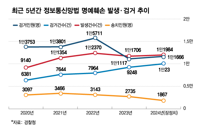 19일 경찰청에 따르면 정보통신망법상 명예훼손 발생 건수는 △2021년 1만1354건 △2022년 1만2370건 △2023년 1만1706건 △2024년 1만1984건 등 2021년 이후 매년 1만건 이상인 것으로 집계됐다. 검거 건수는 2022년 7964건, 2023년 9248건, 2024년 1만23건으로 지난해 처음으로 1만건을 넘겼다.