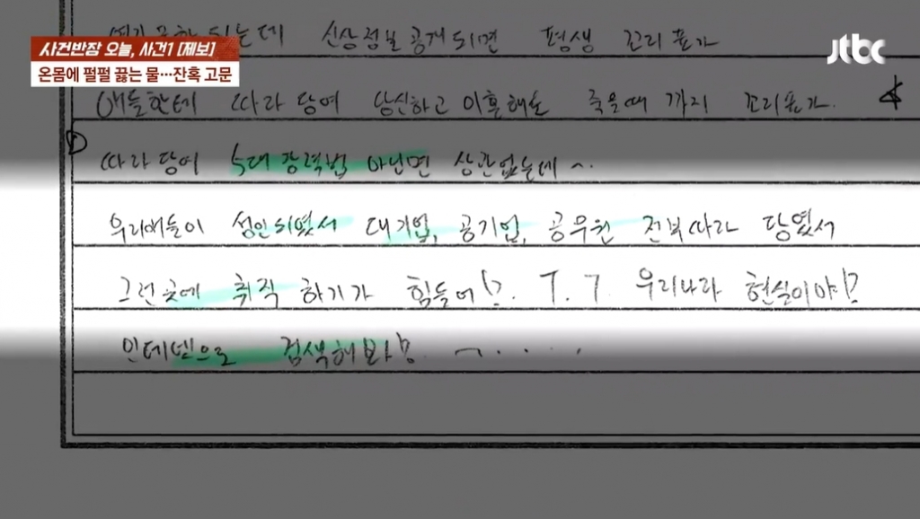 A씨의 가정폭력은 여기서 그치지 않았다. 아내 손발을 묶고 채찍으로 때리는가 하면, 성인기구를 사용해 성고문도 했다. 그는 또 아내가 결혼 전 교제했던 남성을 성폭행으로 허위 신고할 것을 강요했으며, 어린 자녀를 폭행한 혐의도 받는다. 아내는 A씨의 폭력으로 전신에 2도 화상을 입었으며 갈비뼈 4개가 골절되는 등 심각한 부상을 입었다.