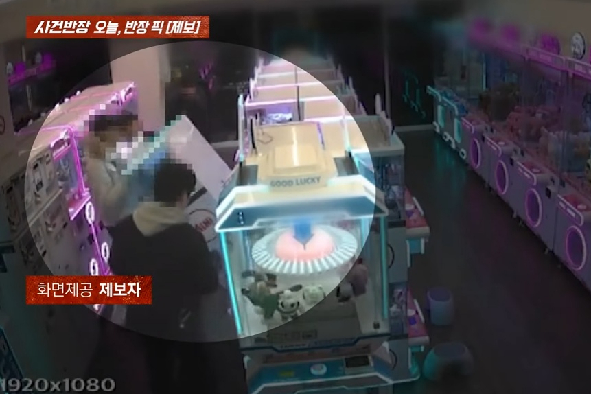 무인 인형 뽑기 가게에서 남성 무리가 기계를 앞뒤로 흔들어 인형을 밖으로 빼내 훔쳐 가는 사건이 발생했다.
