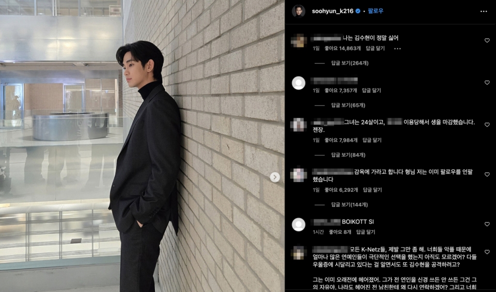 배우 김수현이 고(故) 김새론과 연인 사이였다는 주장이 제기되자 그의 SNS(소셜미디어)에 비판 댓글이 쏟아지고 있다.