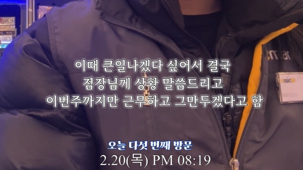 A씨는 영상에서 "이때부터 큰일 나겠다 싶어서 점장님께 상황을 전달하고 이번주까지만 근무하겠다고 했다"며 "근무 마치고 남성이 집까지 쫓아올까 봐 뛰어서 귀가했다"고 토로했다.