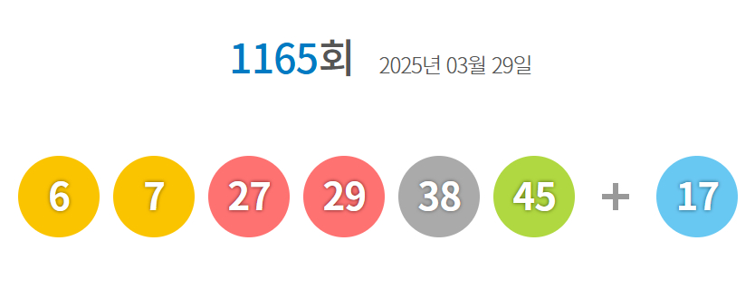 로또복권 운영사 동행복권은 제1165회 로또복권 추첨 결과 '6, 7, 27, 29, 38, 45'가 1등 당첨번호로 뽑혔다고 29일 밝혔다. 2등 보너스 번호는 '17'이다.