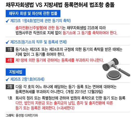 회생기업들의 출자전환 주식에 등록면허세(이하 등록세)를 과세하지 않도록 관련 법이 개정됐지만 법 개정 이전의 과세분도 취소해야 한다는 법원 판단이 처음 나왔다. 이전까지는 지방세법에선 과세한 반면 채무자 회생 및 파산에 관한 법률(채무자회생법)에선 비과세해 혼란이 컸고 많은 회생기업이 등록세 폭탄을 맞았다. 법조계에선 회생기업이 시기에 따라 등록세 과세 여부가 정해진 불공정을 해소하는 계기가 마련된 것이란 평가가 나온다.