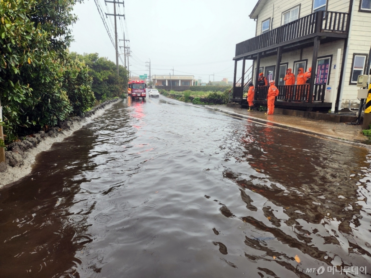 ![[제주=뉴시스] 강풍을 동반한 많은 비가 내리고 있는 22일 오전 제주 서귀포시 성산읍 한 도로가 침수돼 소방당국이 배수 지원에 나서고 있다. (사진=제주소방안전본부 제공)](https://thumb.mt.co.kr/cdn-cgi/image/f=avif/21/2025/04/2025042210454542985_1.jpg)