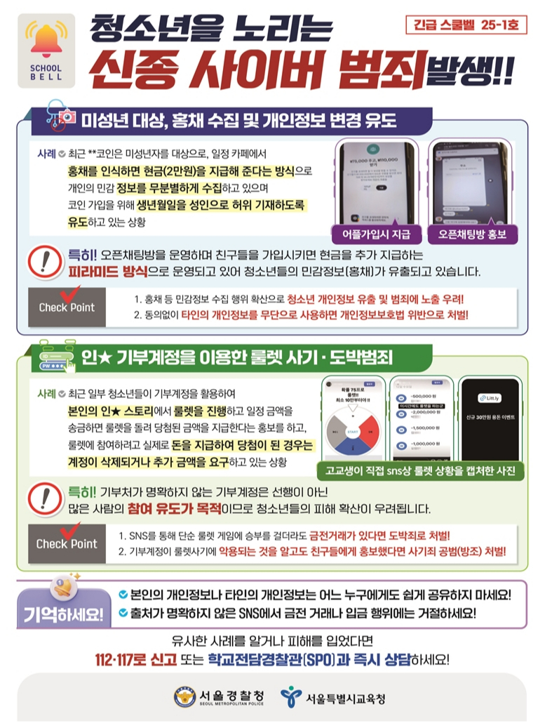 경찰이 청소년들 사이 확산하는 신종 사이버 범죄를 예방하기 위해 서울 지역에 긴급스쿨벨을 발령했다.