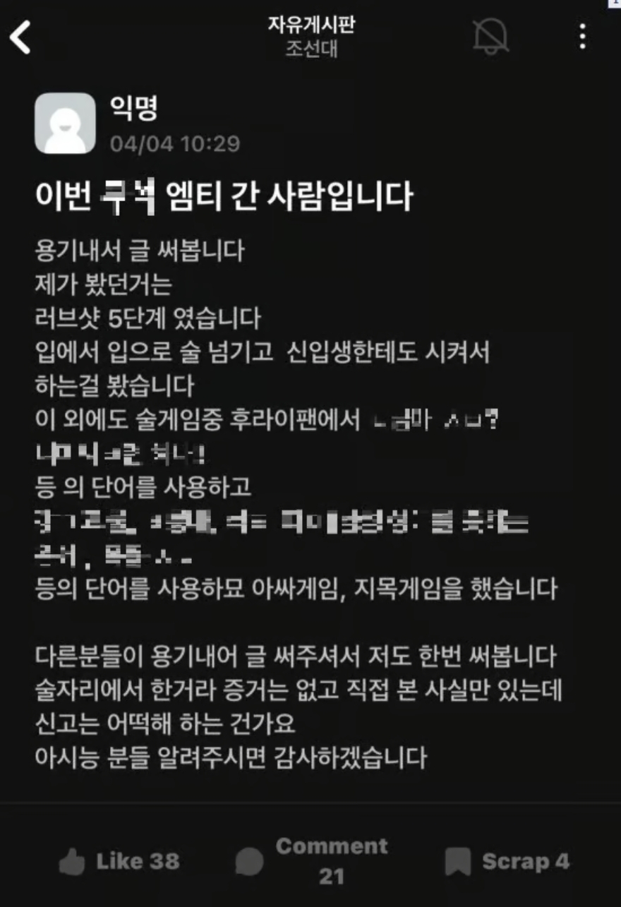 지난달 31일부터 사흘 동안 진행된 조선대 한 학과 MT에서 학생 간 성희롱, 성추행이 있었다는 의혹이 제기됐다. 신입생들에게 입에서 입으로 술을 전달하는 러브샷을 시켰다는 글이 학내 커뮤니티에 올라온 것이다.