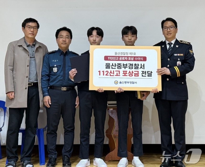 7일 뉴스1에 따르면 울산중부경찰서는 지난 2일 울산 중구 성안중학교 3학년 학생 윤도현, 위제준 학생에게 감사장과 포상금을 전달했다.